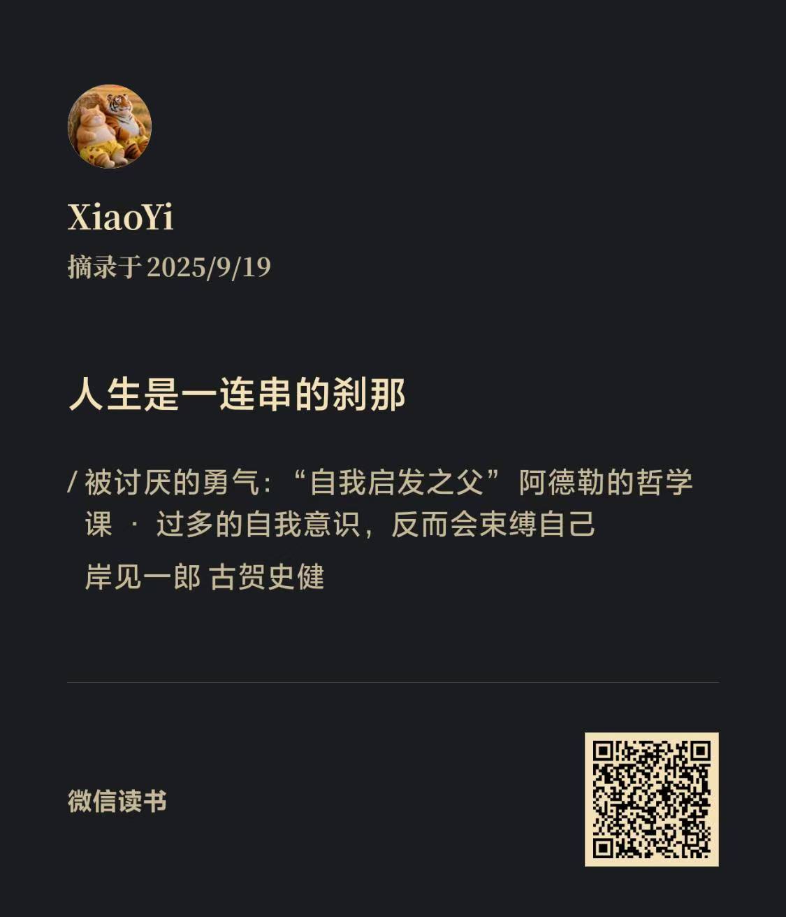 第一次看到这句话是在 cry 的博客中,这句话如当头棒喝,敲醒了昏睡的我。于是立马去翻看了未看完的《讨厌的勇气》,对这句话有了更深的理解。这句话的意思是:人生不是一条连续的线,而是成点的连续。如果人生是一条线,那么和你此刻紧密相接的过往会让你抑郁,规划的未来会让你焦虑。如果人生是连续的点,过去和未来都与当下无关,平静的享受当下就好。换句话说,我们不是活在过去,也不是活在未来,只是只活在当下。阿德勒所想表达的是:痛苦往往源于将过去投射到现在,又将现在抵押给未来。我们不要每天虚构的连续性所困,而要把每一天都当做独立的人生来过。真正的自由,在于认识到每个刹那都是完整的人生。